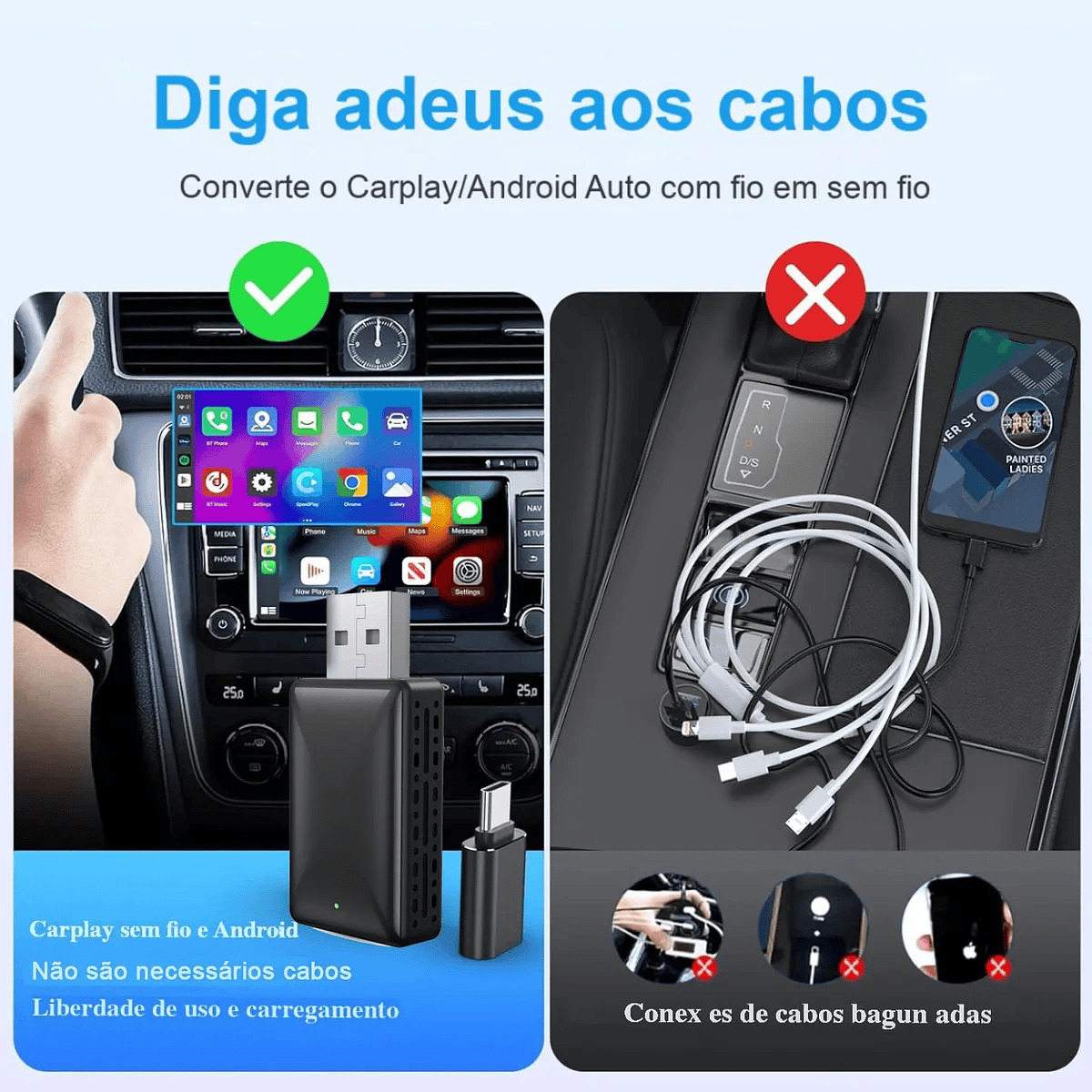Projetado para Carplay e Android Auto, nosso adaptador sem fio oferece uma solução conveniente para o incômodo das conexões com fio. Com esse adaptador, você não precisa mais ficar conectando e desconectando o telefone para garantir uma experiência sem problemas e pode continuar a usar os recursos originais do carro, como Siri, reprodução de música, chamadas telefônicas, navegação e muito mais.