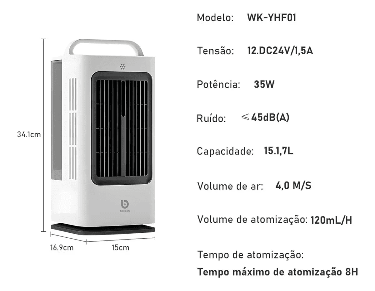 - 35 W de potência.O Climatizador Portátil Fan Branco Com Controle Remoto é a solução ideal para quem busca conforto e frescor em qualquer ambiente. Com um design compacto e elegante, ele se adapta facilmente a diversos espaços, proporcionando um clima agradável durante os dias quentes. Sua altura de 34,1 cm e peso de apenas 2,3 kg permitem que você o transporte com facilidade de um cômodo para outro.