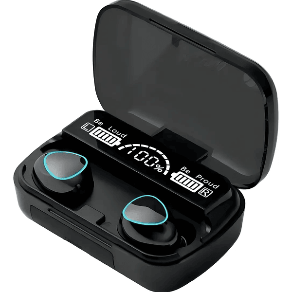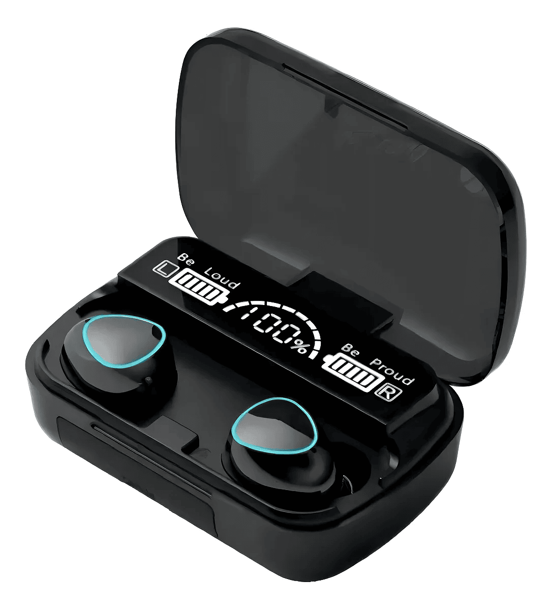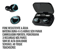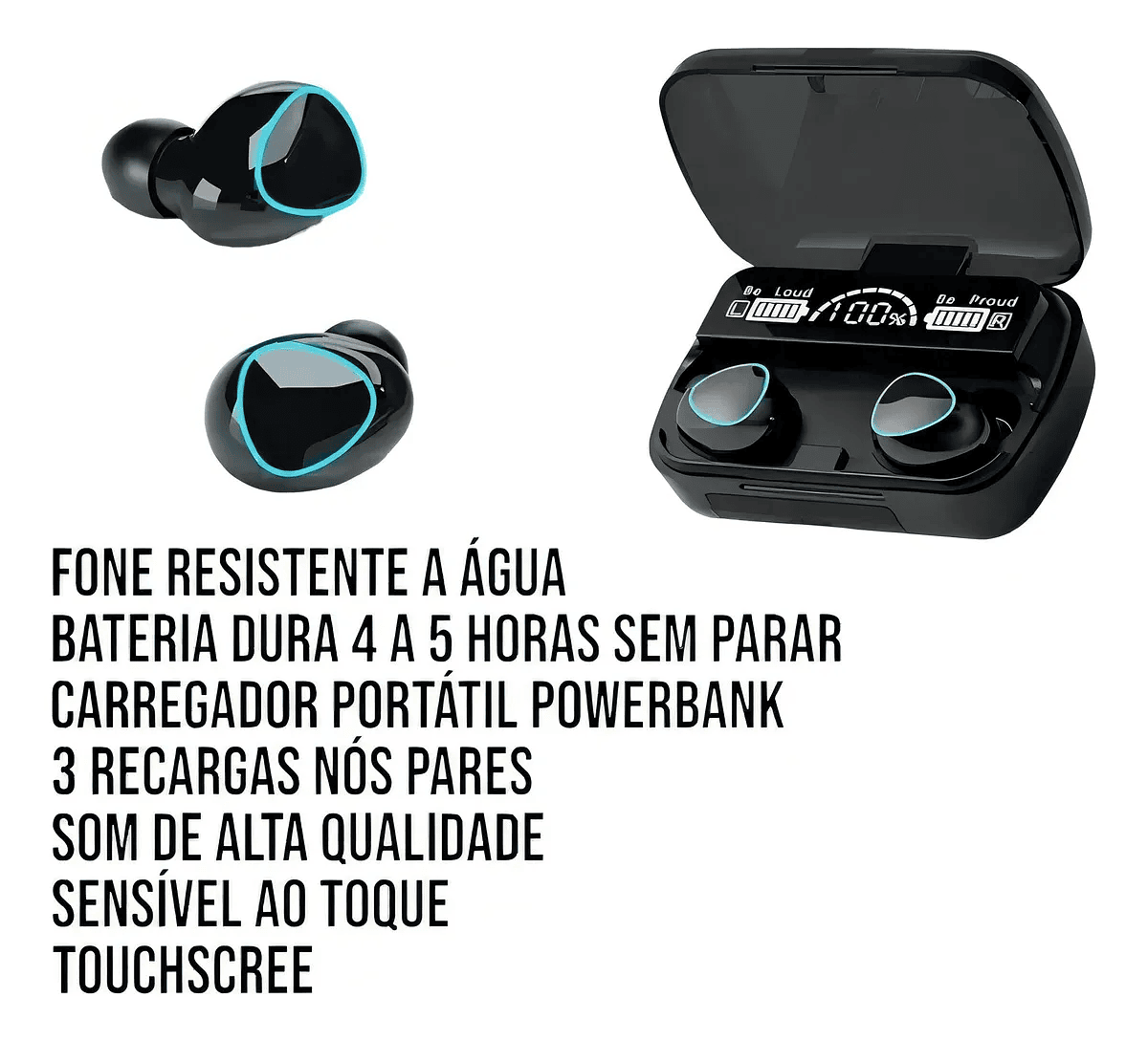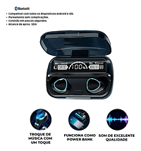Fone M10 TWS Bluetooth 5.1 com display LED que indica a quantidade de bateria da case e processo de carregamento dos fones.