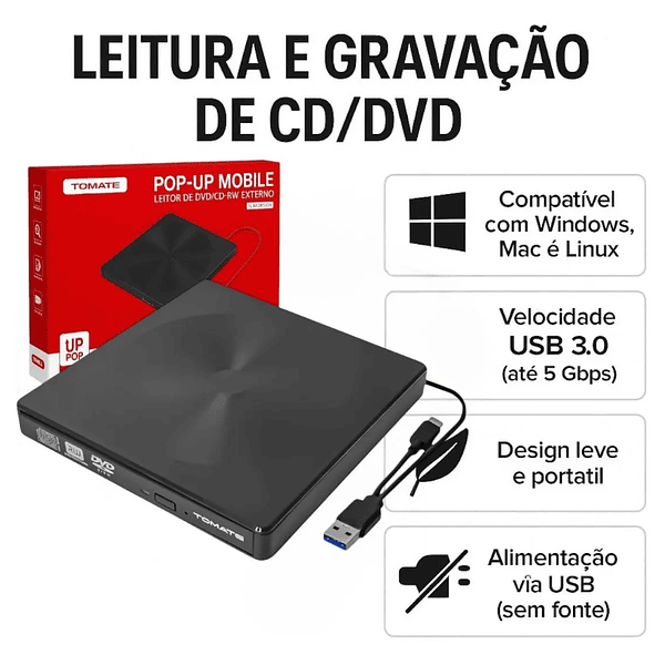 COD: Leitor E Gravador De Dvd Externo Usb 3.0 + Tipo C Pug N Play Preto - rhos