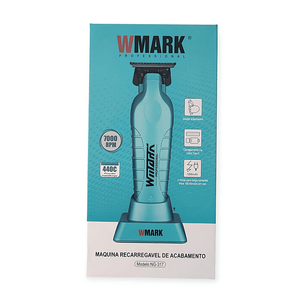 Modelo: NG 317 Marca: Wmark Maquina de Acabamento Recarregável Wmark NG317 Lamina em T em aço inoxidável, lamina móvel de cerâmica. Bateria de lítio: 1200mah Carregamento completo em 3 horas Tempo de Uso: 180 minutos aproximadamente Velocidade do Motor: 7000RPM Carregamento via Cabo USB tipo C Com indicador em Led.